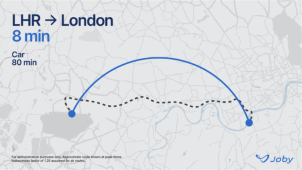 Journeys in the UK could include a 15-minute flight from Manchester Airport to Leeds, or an 8-minute journey from Heathrow Airport to Canary Wharf, instead of 80 minutes by car. Over time, Joby expects to build out a network of landing locations that offer rapid and convenient travel around cities and communities throughout the UK. Joby expects to offer prices that are comparable with existing premium ground ridesharing options at launch.